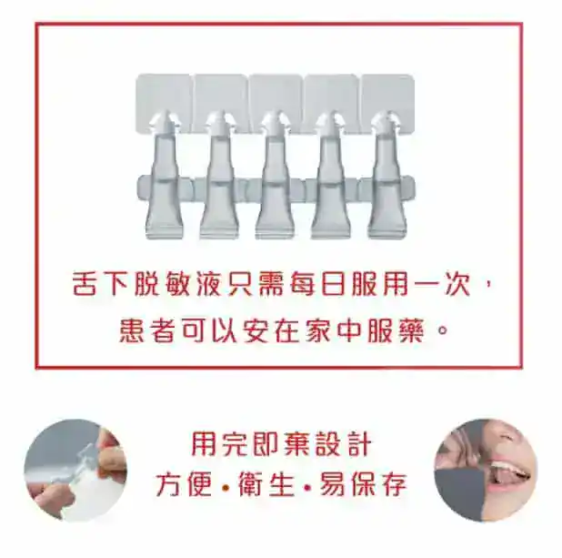 口服脫敏治療,含在舌下 / 脷底,以助患者脫敏。舌下脫敏液只需每日服用一次,患者可以安在家中服藥,無需定時到診所覆診。