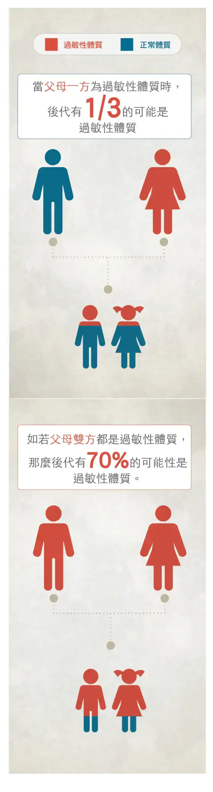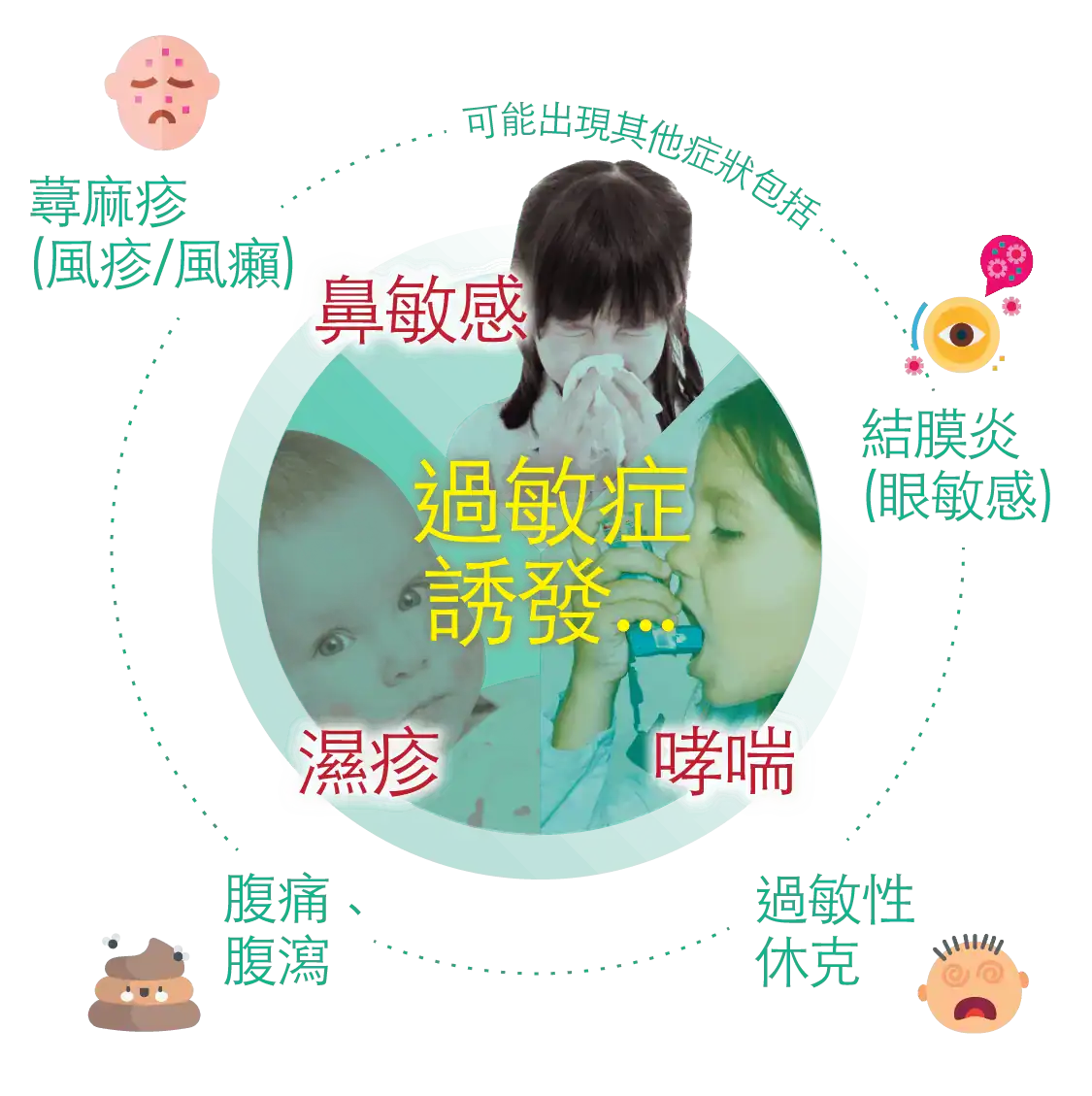 超過一半港人患有一種 或多種過敏症,其中以鼻敏感最常見。在六至七歲兒童中,三 分之一有鼻敏感,一成半有濕疹;中學階段則有一成人有哮喘,百分之五有食物過敏,當中超過百分之十五有嚴重食物過敏病徵。